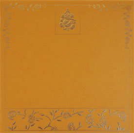 It is an intricately crafted jewelled card with rich traditional rendering. The uniquely design is graced by golden raised image of Lord Ganesha. The kundan work on rich sindori base gives extremely different look with small floral designs and motifs. The envelope is also in rich sindori color having golden paisley print